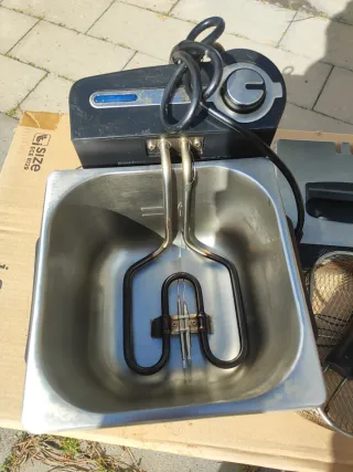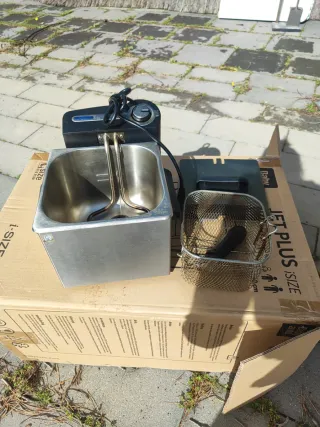 Freidora de acero inoxidable con cesta. - Cubeta de acero inoxidable. - Cesta con asa. - Control de temperatura.
