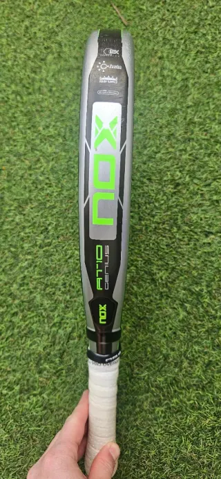 Pala de pádel Nox AT10 12K con un diseño moderno y llamativo. - Superficie con acabado rugoso arenoso - Marco de carbono. - Núcleo de goma. - Diseño con detalles en verde y gris. No tiene ninguna fisura, tiene los 4 rasguños típicos y algún salto de pintura, pero la pala no tiene mucho uso.