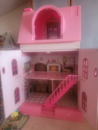 Preciosa casa de muñecas de dos plantas con detalles en rosa. - Fachada con ventanas y puerta decoradas. - Techo curvo y chimenea en color rosa. - Escaleras de acceso en la parte delantera. Medidas 1,40 cm de alto 75cm de ancho.