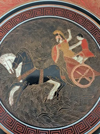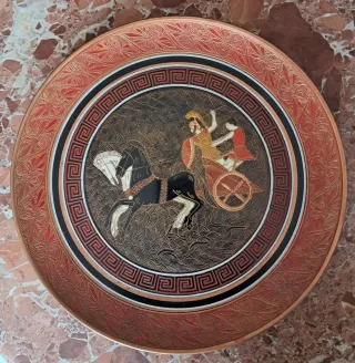 Plato decorativo de cobre con escena de la Guerra de Troya. Representa a Aquiles en su carro de guerra. 28cm de diametro - Material: Cobre. - Diseño: Escena de la Guerra de Troya. - Motivo: Aquiles en carro de guerra.
