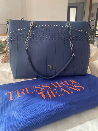 Elegante bolso Trussardi Jeans en color azul, con un diseño moderno y detalles de tachuelas. - Asa de cadena metálica. - Cierre seguro. - Logo de la marca en la parte frontal. - Con bolsa de la marca original. No conserva la etiqueta, pero está para estrenar (las cremalleras interiores tienen aún los protectores).