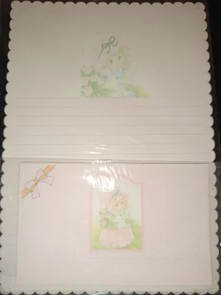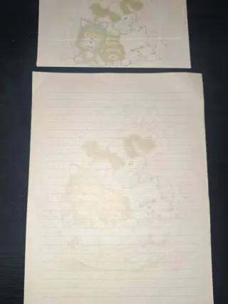Conjunto de papel de carta con diseños infantiles de ositos, conejos y gatitos. Ideal para escribir notas o cartas. - Ilustraciones tiernas y coloridas. - Diseños variados con animales. - Estilo acuarela suave.