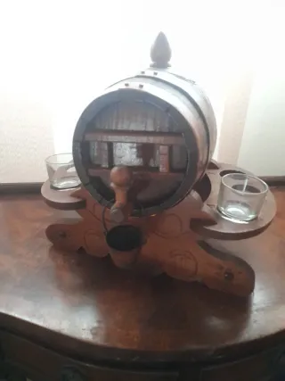 Pequeño barril decorativo de madera con detalles metálicos. 22 cm fondo. 22 cm altura y 30 cm ancho - Diseño rústico. - Incluye dos pequeños vasos de cristal.
