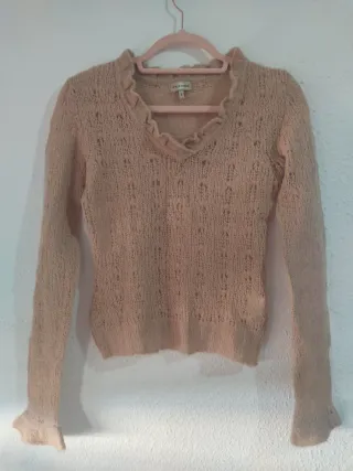 Jersey de Amichi de punto fino con un diseño calado y detalles de volantes en el cuello, de manga larga, cuello en pico, y bajo y puños elásticos, está como nuevo