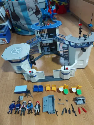 Completa comisaría de policía de Playmobil, ideal para recrear escenas de acción y rescate. Incluye todo lo que se ve en las fotos. - Edificio principal con torre de control y helipuerto. - Varias figuras de policías y personal. - Accesorios como sillas, taquillas, armas y equipamiento. - Escaleras y pasarelas para conectar las diferentes partes.