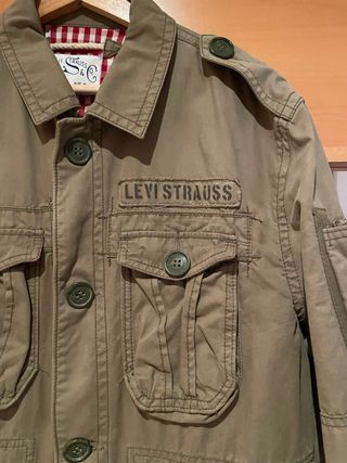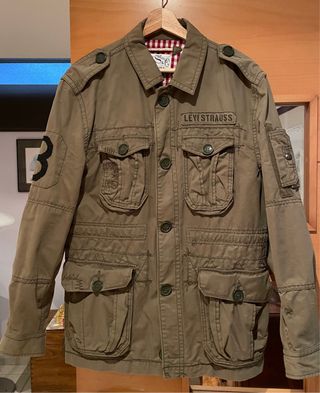 Chaqueta estilo militar de Levi's en color verde oliva. Presenta un diseño con múltiples bolsillos y detalles. Es talla M , pero vale también para talla L. - Cierre de botones. - Bolsillos frontales con solapa. - Detalle de parche en manga. - Cuello camisero.