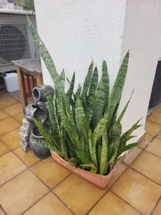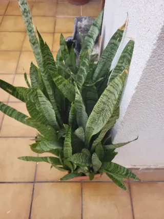 Planta de interior Sansevieria, también conocida como Lengua de Suegra. Es una planta muy resistente y fácil de cuidar. - Hojas verdes con patrones plateados. - Ideal para purificar el aire.