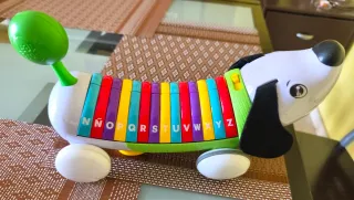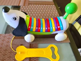 Divertido perrito de Leap Frog con letras del abecedario. - Diseño de perro salchicha. - Teclas de colores con letras. - Cola verde. - Ruedas para arrastrar.