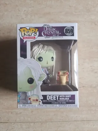 Figura Funko Pop de Deet con Baby Nurlock de la serie The Dark Crystal: Age of Resistance con la caja dañada. - Número de figura: 859. - Personajes: Deet y Baby Nurlock. - Serie: The Dark Crystal: Age of Resistance.