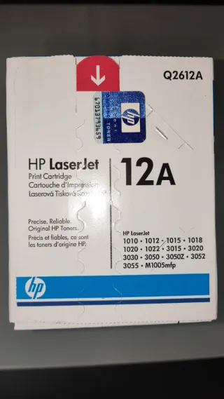 Un cartucho de tóner original HP LaserJet 12A. - En su embalaje original con precinto - Modelo: Q2612A - Color: NEGRO - Paginas: 2000 aproximadamente - Es válido para todas estas impresoras: HP LaserJet 1005 MFP HP LaserJet 1010 HP LaserJet 1012 HP LaserJet 1015 HP LaserJet 1016 HP LaserJet 1018 HP LaserJet 1020 HP Laserjet 1020 Plus HP LaserJet 1022 HP LaserJet 1022 N HP LaserJet 1022 NW HP LaserJet 3015 HP LaserJet 3020 HP LaserJet 3030 HP LaserJet 3050 HP LaserJet 3052 HP LaserJet 3055 HP LaserJet M1005 MFP HP LaserJet M1319 MFP HP LaserJet M1319 MFP HP LaserJet M1319f