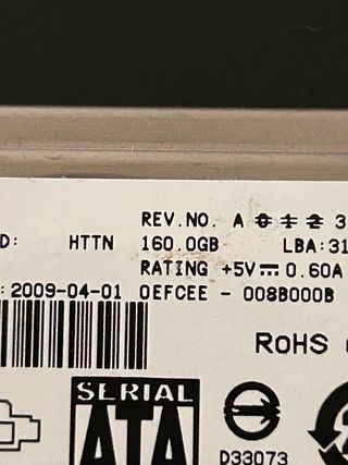 Disco duro interno de 2.5 pulgadas con capacidad de 160 GB. Ideal para portátiles. - Interfaz SATA. - Modelo MHZ2160BH G2. - Fabricado en Tailandia. - Fecha de fabricación: 2009-04-01. Funcionando y formateado