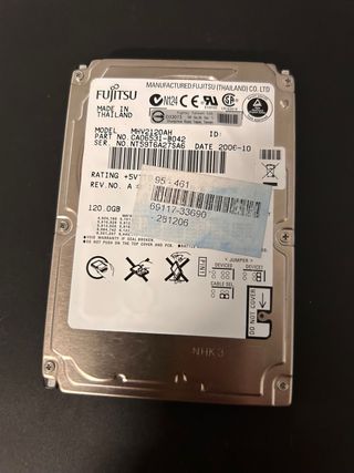 Disco duro interno de 2.5 pulgadas con 120 GB de capacidad. - Modelo: MHV2120AH - Interfaz: IDE/PATA (44 pines) - Capacidad: 120 GB - Fabricado en Tailandia - Fecha de fabricación: Octubre 2006