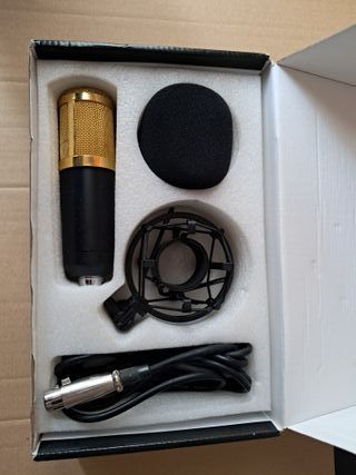 Micrófono profesional tipo condenser con acabado en negro y detalles dorados. Incluye accesorios para su uso.Vendo Microfono Profesional Condenser, no se ha utilizado nunca. Se ha sacado varias veces de la caja pero no se ha usado, asi que esta nuevo sin usar - Rejilla protectora dorada. - Soporte tipo araña. - Filtro anti-pop. - Cable de conexión.
