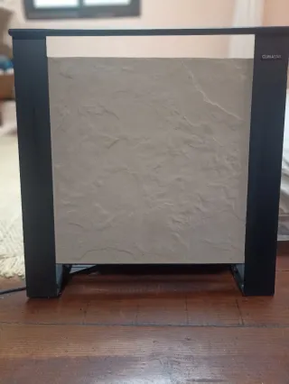 Elegante estufa eléctrica con un diseño moderno y sofisticado. Su acabado en piedra le da un toque único y distinguido a cualquier espacio. - Marco exterior en color negro. - Panel central con textura de piedra en tono beige. - Base estable para colocar en el suelo.