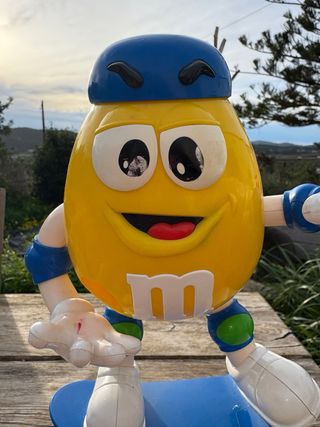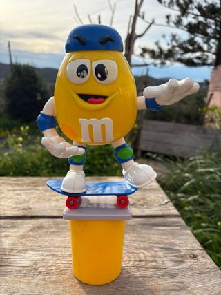 Este dispensador de M&M's de los años 90 es un artículo de colección único. Presenta un diseño divertido con un personaje M&M's sobre un monopatín. - Diseño vintage de los 90. - Personaje M&M's con gorra azul. - Incluye monopatín azul con ruedas rojas. - Base amarilla. - Brazo izquierdo articulado Moviendolo hacia abajo la mano izquierda Tira golosinas Funciona perfectamente Está bastante bien para los años que tiene Los ojos tienen unas manchitas blancas Por lo demás está muy bien para los amantes de los juguetes vintage es precioso