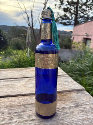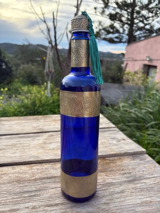 Elegante botella de cristal azul con detalles metálicos plateados, inspirada en el diseño marroquí. Con una capacidad de 70cl. - Diseño ornamental en metal. - Tapa decorada con borla. - Ideal como pieza decorativa Botella de cristal azul y metal de Marruecos 70cl Para Agua, zumo etc…
