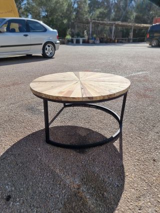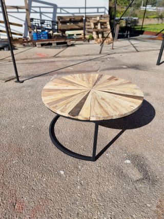 Se vende mesa hecha de trozos de teca e iron wood con patas se hierro. Las medidas son 80cm de diámetro y 40cm de alto. - Tablero circular con diseño radial de listones de madera. - Base de metal negro con forma curva.