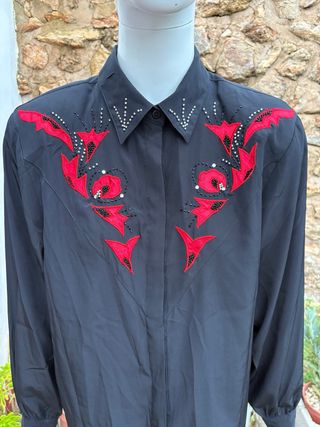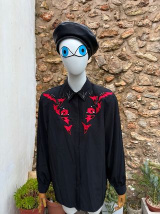 Camisa de estilo western vintage de los años 80. Presenta un diseño llamativo con detalles en contraste. - Cuello camisero. - Mangas largas. - Adornos bordados en la parte delantera.