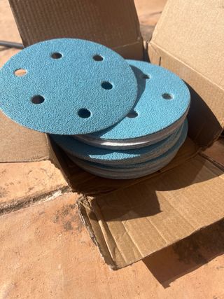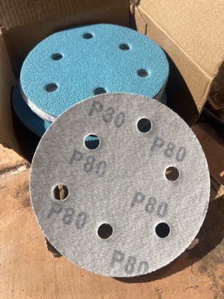 Pack de lijas circulares de color azul, diseñadas para lijadoras. Vienen en un práctico paquete. - Diámetro: 125 mm. - Número de agujeros: 6 - Grano: 80.
