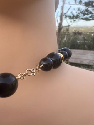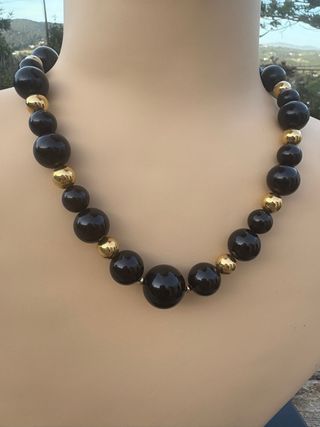Elegante collar vintage de la marca Monet, con un diseño de bolas en tonos negros y dorados. -Bolas de diferentes tamaños. - Cierre seguro. Con la marca de Monet Collar Monet años 80’s vintage En Baquelita de color negro Y bolas bañadas en oro. Una pieza de colección para los amantes de las joyas auténticas vintage de los hermanos Monet Joyas de coleccionista