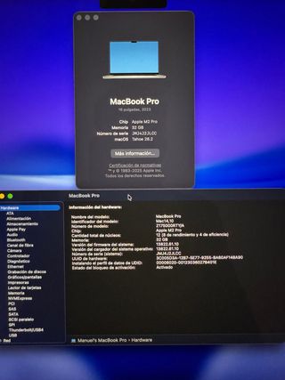 MacBook Pro 15.4" (hasta 2021) reacondicionado en muy buen estado. Batería NUEVA 100%, 2 meses garantía. No lo necesito. Especificaciones clave: Intel Core i7 6 núcleos (2.2–4.3 GHz) Gráficos: Intel UHD 630 + AMD Radeon Pro 560X/555X 4 GB 32 GB RAM DDR4 2400 MHz SSD 512 GB Pantalla Retina 2880x1800 (3K), excelente calidad 4× Thunderbolt 3 (USB-C), jack 3.5 mm, WiFi, BT, Touch Bar + Touch ID, teclado retroiluminado Ligeras marcas de uso (aluminio), carcasa y teclado limpios/desinfectados, bisagras y puertos perfectos. Limpieza interna de ventiladores: silencioso, fresco y rápido. macOS Sonoma/Sequoia limpio. Incluye cargador. Sin i