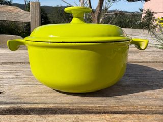 Olla Le Creuset de diseño icónico de los años 70. -Pieza de colección. Enzo Mari la Mama. - Color verde limon vibrante. - Asa en la tapa para facilitar el manejo. Olla le creuset mide 17cm de ancho y 7 cm de alto. Colección la Mamá Enzo Mari años 70’s es una pieza de colección es preciosa Está en buen estado sobre todo en el interior está perfecto Ojo solo tiene una pequeño punto negro en el esmalte de la tapa que no afecta para nada en su uso Sirve para todas las cocinas Fuego de gas Inducción Vitroceramica Horno Etc… Es una pieza preciosa de colección años 70’s