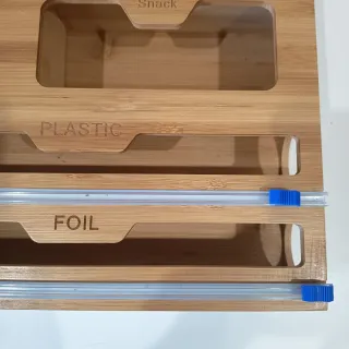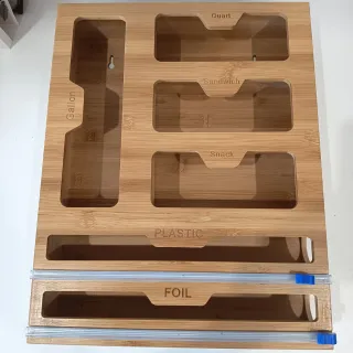 Organizador de bambú para bolsas de almacenamiento de alimentos. - Compartimentos para bolsas de galón, sándwich y snack. - Ranura inferior para papel film y aluminio. Con cortador incluido. - Nuevo vale 37€.