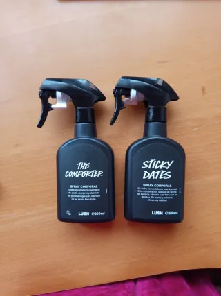 Dos sprays corporales de la marca LUSH. Cada uno vale 20 €. Si coges los dos, 35€. - The Comforter Spray Corporal. - Sticky Dates Spray Corporal. - Cada uno contiene 200ml.
