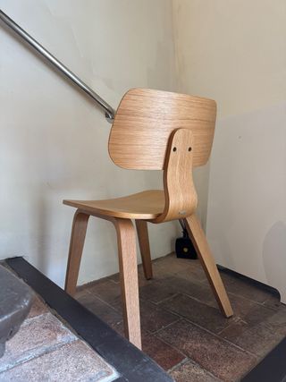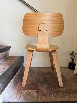 Silla de diseño moderno con un acabado en madera natural chapa de roble. 7 unidades disponibles - Patas de madera robustas. - Respaldo curvo ergonómico. - Asiento contorneado para mayor comodidad.