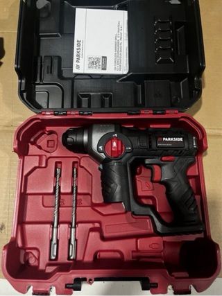 Taladro percutor inalámbrico Parkside Performance de 12V modelo PBHAP 12 A1, Motor sin escobillas 3 funciones ajustables: taladrar con impacto (con mecanismo de impacto), atornillar o taladrar (sin mecanismo de impacto), cincelar (solo mecanismo de impacto) Sistema de fijación de herramientas conforme al sistema SDS-plus Energia de impacto: 1,1 julios No incluye bateria ni cargador pero es compatible con las baterias de la serie 12v
