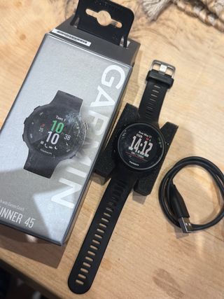 Reloj deportivo Garmin Forerunner 45 en color negro. Ideal para corredores y deportistas. - Diseño ligero y cómodo. - Pantalla clara y fácil de leer. - Correa ajustable.