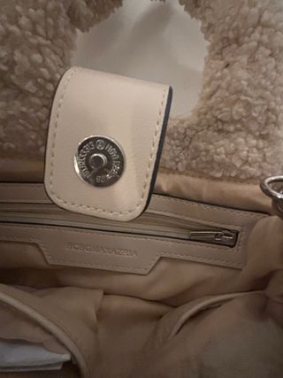Bolso de mano y bandolera con diseño patchwork. - Material exterior tipo borreguito. - Combinación de tonos beige y marrón. - Asa corta y correa bandolera ajustable.