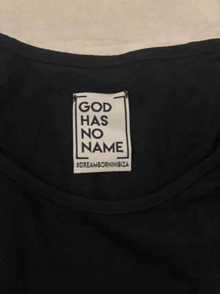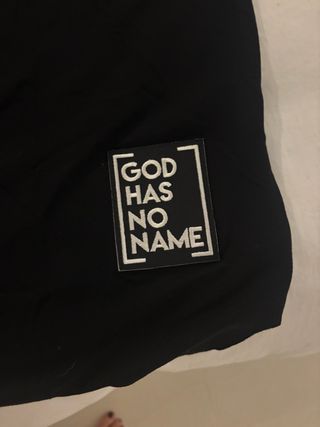 Camiseta negra con un diseño gráfico distintivo. - Estampado God Has No Name en blanco. - Parche con el diseño.