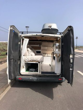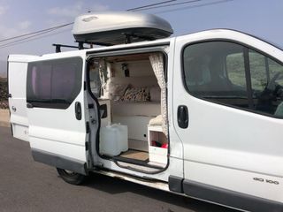 Furgoneta Nissan Primastar Camperizada (no homologada) Con ITV está recién pasada. Tiene 330.000km, se cambió el motor a los 200.000km. Diésel Tiene 3 plazas para viajar. Sofá cama abatible de dos plazas y juegos de sábanas. Almacenaje con cómoda, todo el frontal y hueco debajo de la cama. 2 Depósitos de 10 litros de agua. Tiene camping gas portátil de dos. Nevera con congelador. Todo lo necesario de platos, vasos, sartén... Batería extra de litio de 200Ah. Aislamiento y recubrimiento de madera. Tomas de 12v y usb distribuidos por toda la furgoneta Precio: 10.000 € (negociables) Cualquier duda o si quieres verla contáctame por privado