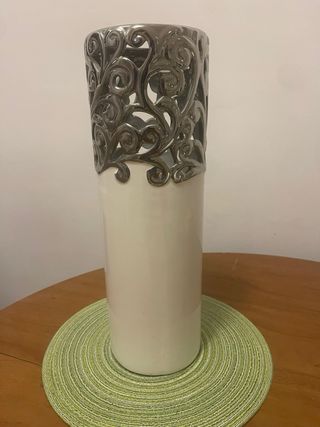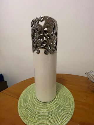 Elegante jarrón de cerámica con un diseño decorativo en la parte superior. - Acabado en blanco y plateado. - Detalle ornamental calado en metal.