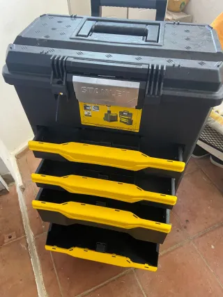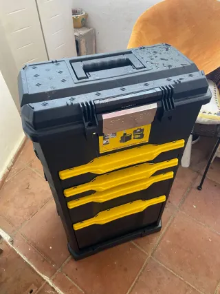 Carro de taller móvil de la marca Fatmax STANLEY. Ideal para organizar y transportar herramientas. - Diseño robusto en color negro y amarillo. - Múltiples cajones para almacenamiento. - Asa de transporte integrada.