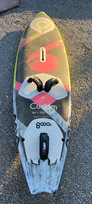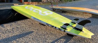 Tabla de windsurf Goya Custom Wave Thruster de 86 litros. Diseñada para olas. - Modelo: Custom Wave Thruster - Volumen: 86 L - Color: Verde lima con logo blanco - Aletas: Incluye 3 aletas negras
