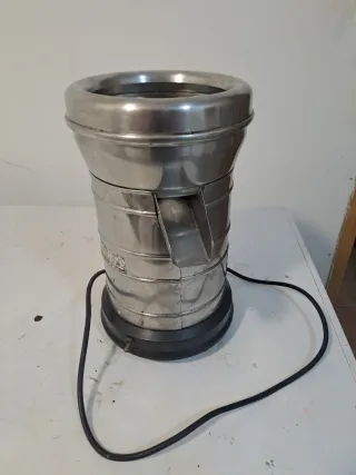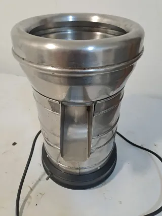 Exprimidor de diseño industrial fabricado en acero inoxidable. Cuenta con una base negra y un cable de alimentación. - Material: Acero inoxidable - Color: Plateado - Base: Negra - Incluye cable de alimentación solo le falta el exprimidor funcionando perfectamente