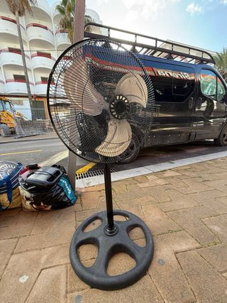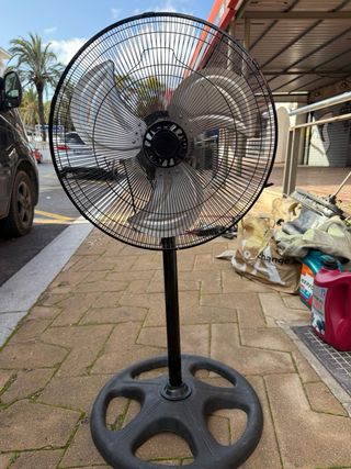 Ventilador de pie en color negro. Cuenta con una base redonda y un diseño clásico. - Rejilla protectora. - Altura ajustable. - Aspa de aluminio