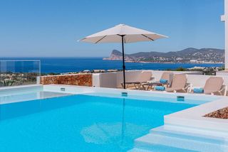 Royal Estates proudly presents this stunning 8 bedroom villa, which is divided over three levels with private pool and 180-degrees sea and sunset views. Nestled on a mountain hill on the west-coast of Ibiza, this unique and fully renovated property is a true gem, ready to fulfil your Mediterranean dreams and capture the essence of the Ibiza lifestyle. Important to mention is that the whole house is wheelchair accessible indoor and outdoor. INTERIOR El Refugio is a unique property spread over three living levels, each with its own private entrance, making it the perfect home for a large family or entertaining with friends, while maintaining privacy from other guests. The main floor, ground floor, and basement floor each offer distinct living areas, complete with living rooms, kitchens, bathrooms, and private driveways. Stepping inside, you will immediately be charmed by the interior design featuring high-quality materials. The house is fully renovated, counting a total of 8 bedrooms, 6 bathrooms and 2 guest toilets across a total of 391m2 of living spaces: First floor: Enter through the main entrance to find the dining area with an open kitchen and island, connected to a large terrace with stunning sea views. This floor also includes a living room, a separate TV room, 3 bedrooms, 2 bathrooms, and a guest toilet. Ground floor: Accessible from the parking area or poolside, this level includes a living room with an open kitchen, a guest toilet, 2 bedrooms with en-suite bathrooms, 2 additional bedrooms sharing a bathroom, and a laundry room. Basement level: Features a separate guest apartment under the pool, with a private driveway and parking for two cars. This apartment includes a kitchen, living room, bedroom, and bathroom, with beautiful sea views even from this lowest level. EXTERIOR Each level of the house offers plenty of outdoor terrace spaces for sunbathing or relaxing under covered areas. All terraces provide wide-open sea views, given the high mountain lo