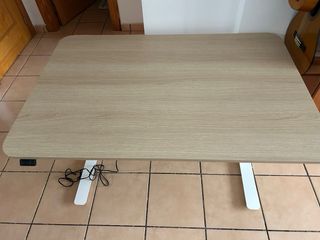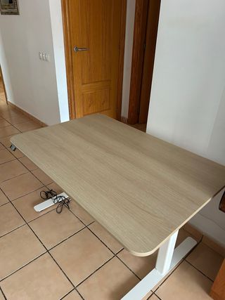 Escritorio moderno con superficie de madera y estructura de metal. - Diseño elegante y funcional. - Patas blancas ajustables en altura. 80x120 cm
