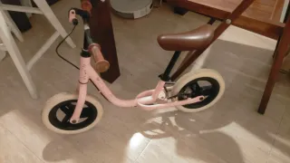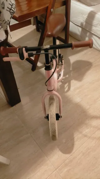 Bicicleta de aprendizaje de color rosa, ideal para los más pequeños. - Marco de metal. - Ruedas blancas. - Sillín marrón.