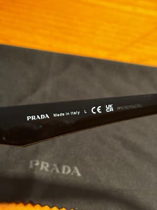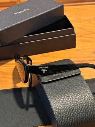 Elegantes gafas de sol Prada. - Montura de acetato negro. - Lentes con protección UV. - Logo de Prada en las patillas.