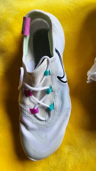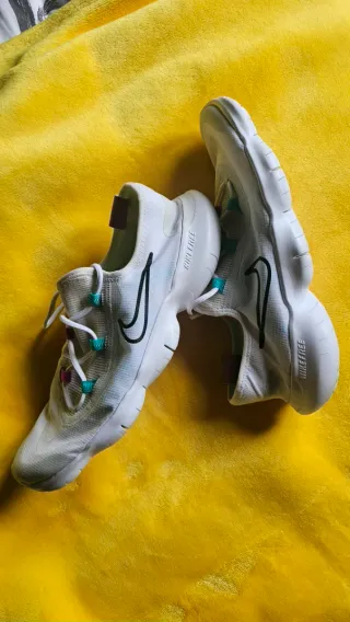 Zapatillas deportivas Nike Free en color blanco con detalles en verde azulado. Perfectas para correr o entrenar. - Diseño ligero y flexible. - Cierre con cordones. - Logo de Nike en el lateral.