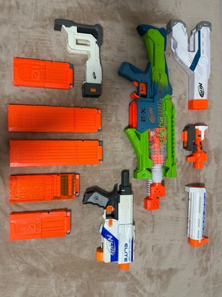 Se vende pack de Nerf que incluye una Nerf Retaliator y una Nerf Doble Punch. - Pistola Nerf Retaliator blanca y gris. - Pistola Nerf Doble Punch verde y azul. - Incluye varios cargadores naranjas. - Culata y Mira de acessorio Muy muy poco usadas, la doble punch esta nueva. Vienen con muchas balas.
