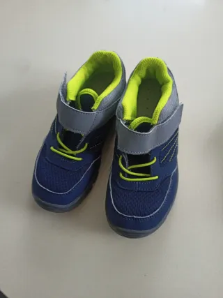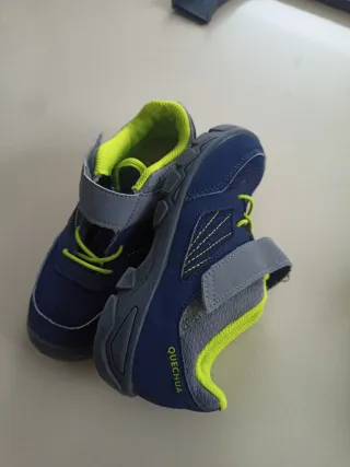 Zapatillas de montaña Quechua para niñ@s en talla 30. Diseñadas para actividades al aire libre. - Color azul con detalles en verde lima. - Cierre de velcro y gomas elástica. - Suela de goma.