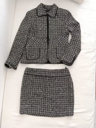 Conjunto de chaqueta y falda de tweed de H&M. Está como nuevo. Pone que es una XXL pero mas bien es una L. - Chaqueta con cuello - Bolsillos delanteros - Falda de corte recto