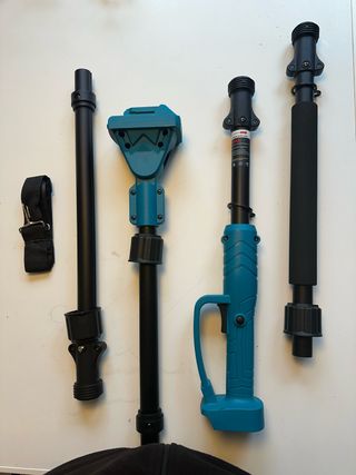 Accesorio extensible para herramientas de poda eléctrica. - Diseño telescópico para ajustar la longitud. - Compatible con tijeras y sierras de podar eléctricas. - Incluye correa de sujeción. - No incluye bateria - Comprobar los pines de la parte inferior de su bateria si es de 2 o 3 pines si es de 2 no funciona.