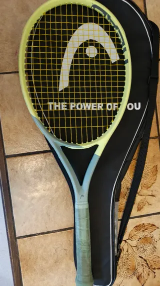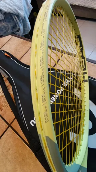 Raqueta de tenis Head The Power. - Color amarillo y gris. - Tamaño de cabeza: 645 cm² / 100 in². - Peso: 285 g / 10.1 oz. - Longitud: 685 mm / 27 in. - Balance: 325 mm / 0.7 in HL. - Perfil del marco: 23/26/27 mm. - Patrón de cuerdas: 16/19.