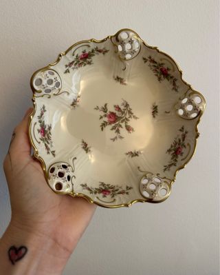 Elegante cuenco 3 patas de porcelana vintage de la colección Moliere de Rosenthal. La marca específica con la corona, las varas cruzadas y la inscripción "KRONACH GERMANY" se usó aproximadamente entre 1901 y 1933. - Diseño Moosrose con delicadas flores. - Borde festoneado con detalles dorados. - Aberturas decorativas en el borde.